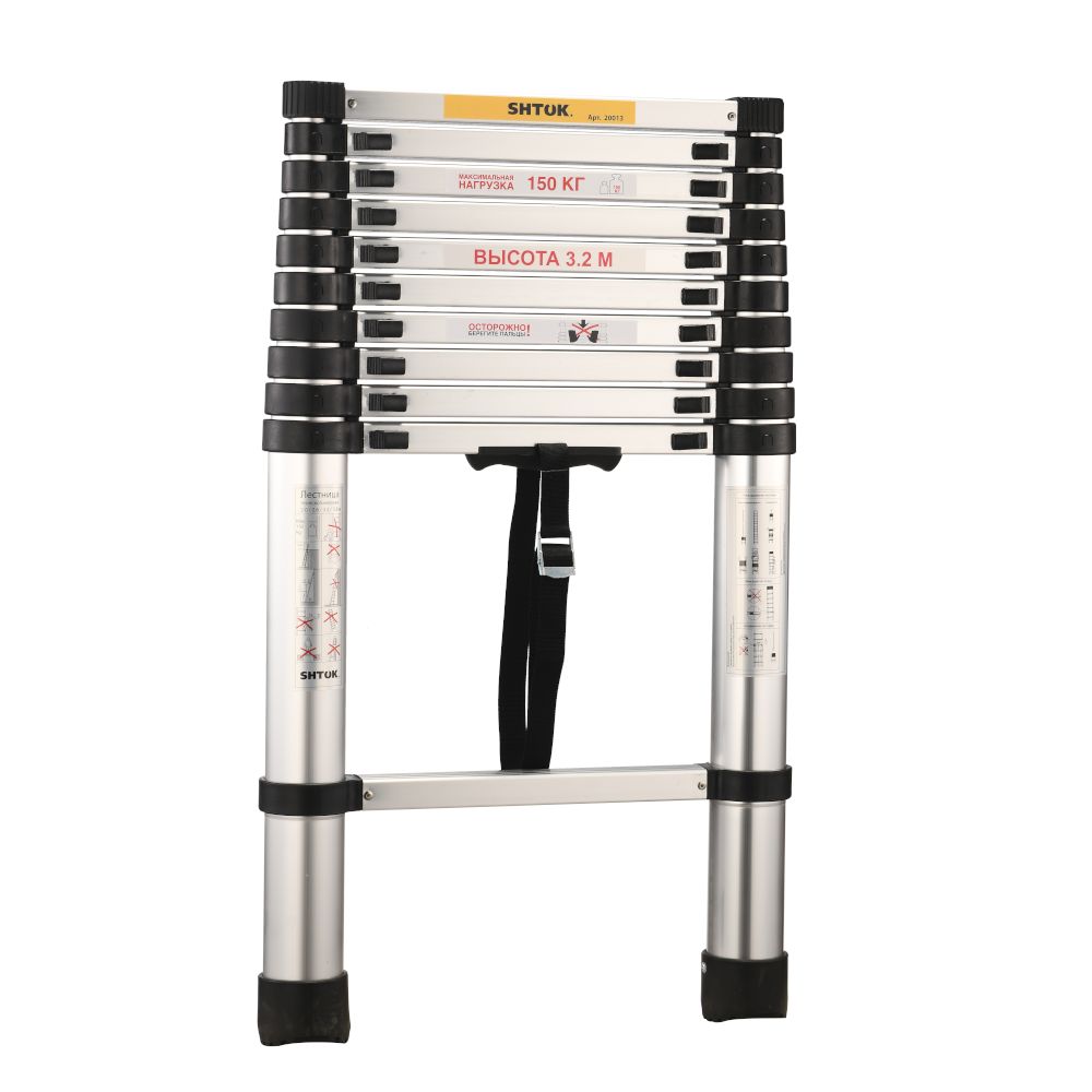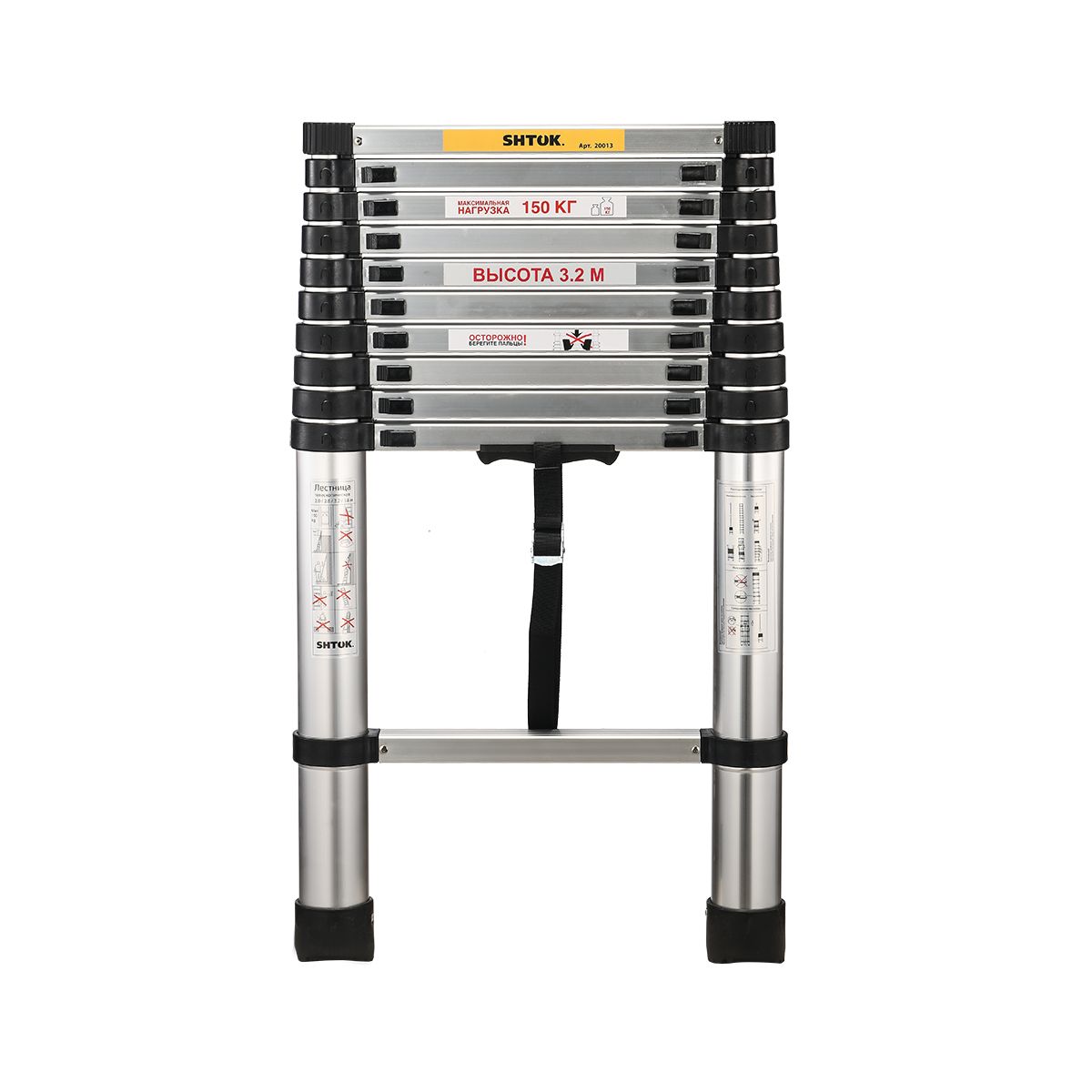Телескопическая лестница SHTOK 3.2м 20013 выдерживает нагрузку до 150 кг за счет конструкции, выполненной из дюралюминия и первичного пластика. На стенде испытываемая лестница выдерживает 10 000 циклов на раскрытие-закрытие.