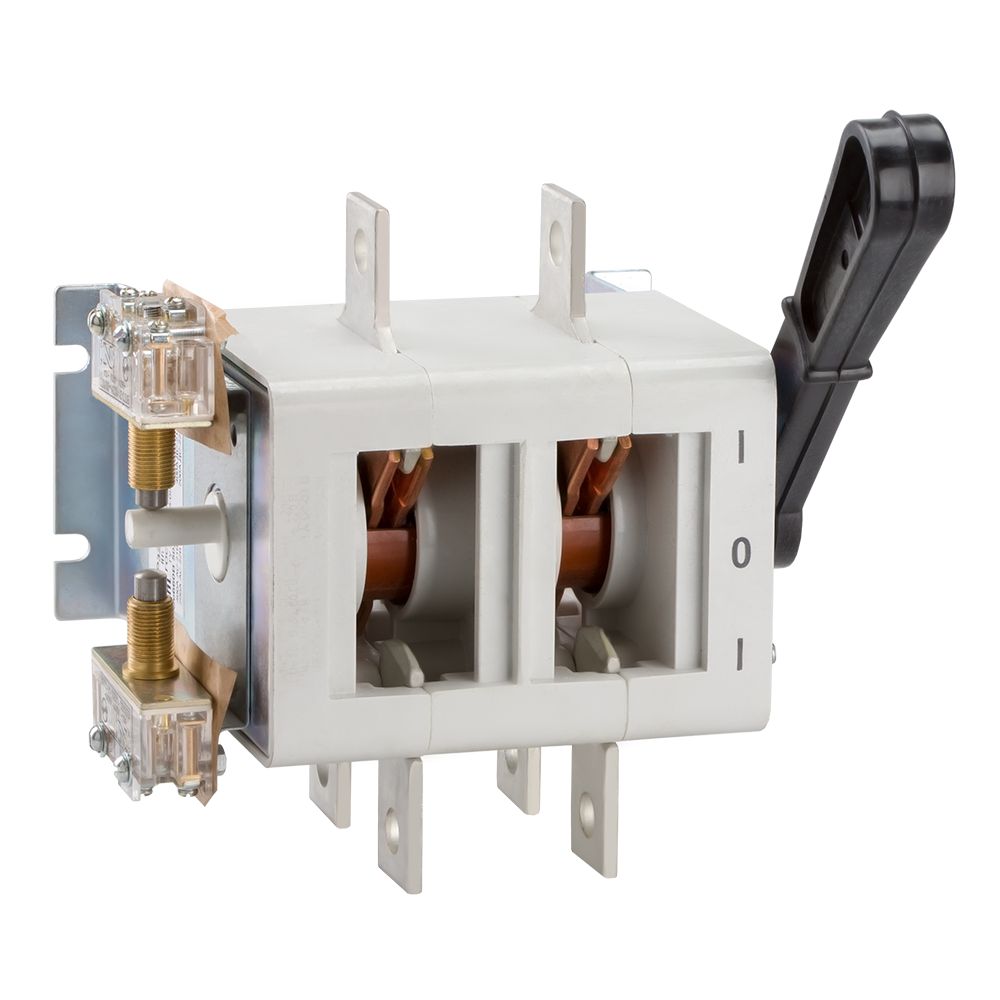 Выключатель-разъединитель 2 полюсный на номинальный ток 400 А, в котором установлена несъемная рукоятка.