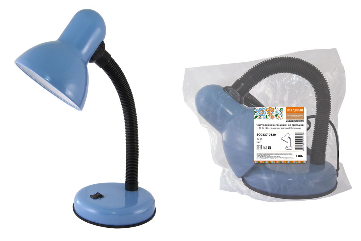 Светильник настольный на основании 40Вт, E27, синий, (мягкая упак.) Народный